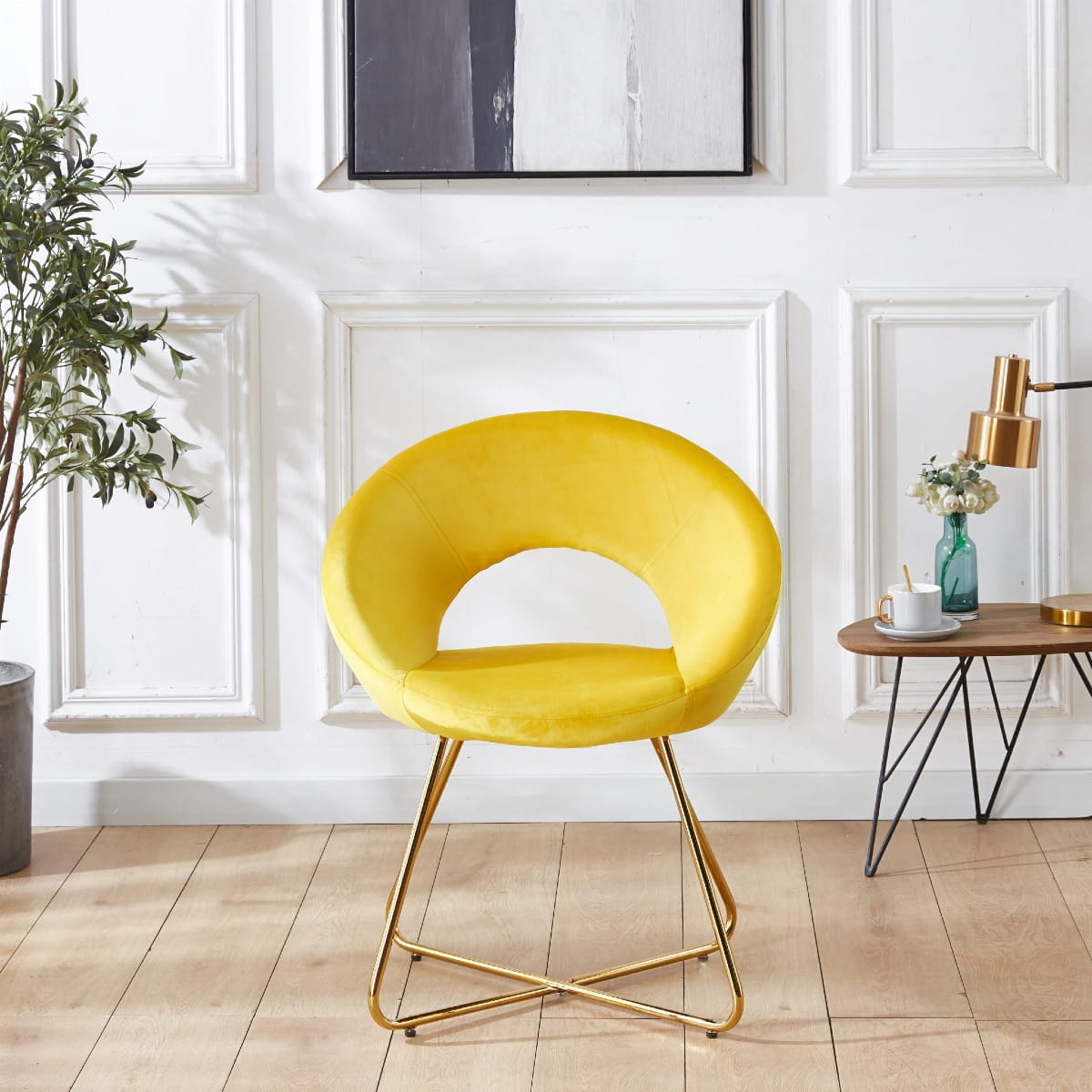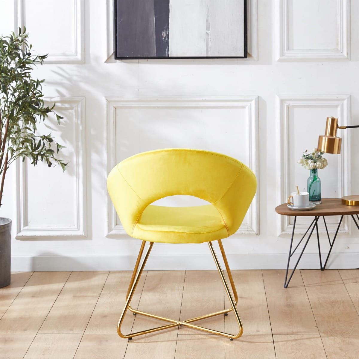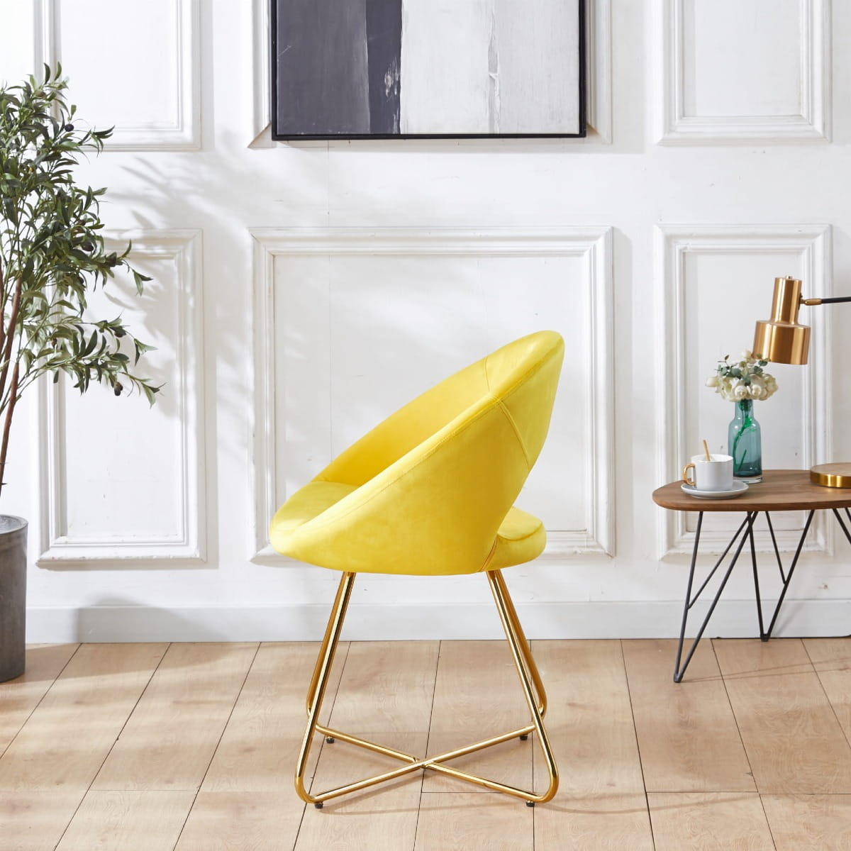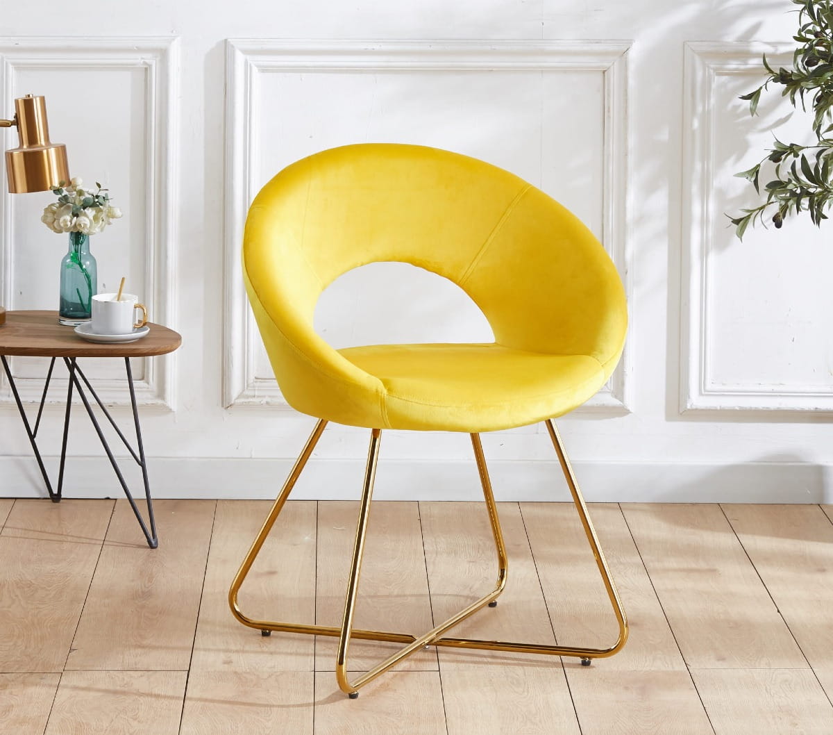 Fotel tapicerowany doskonale nadaje się do wnętrz w stylu skandynawskim, i nowoczesnym. Wykonane z wytrzymałej tkaniny welurowej typu velvet w kolorze żółtym, krzesło będzie się pięknie wyróżniało na tle każdego pokoju a jednocześnie nie będzie przytłaczało wystroju dzięki swojej lekkiej formie. Stabilna metalowa podstawa malowana na kolor złoty, cechuje się wysoką odpornością na uszkodzenia i trwałością na długie lata.