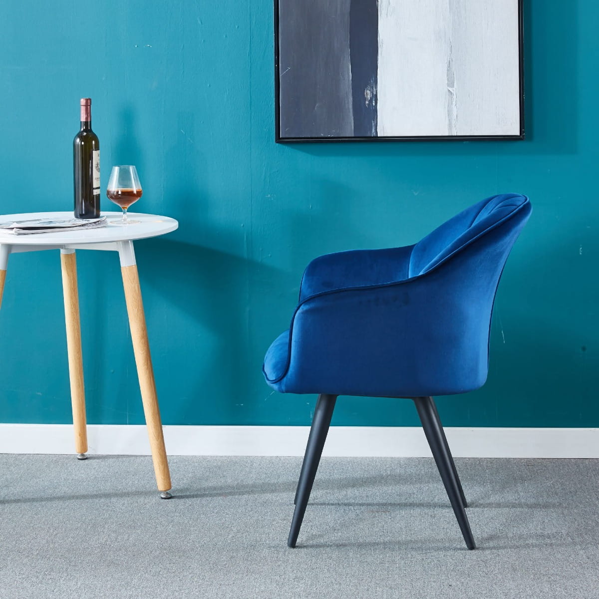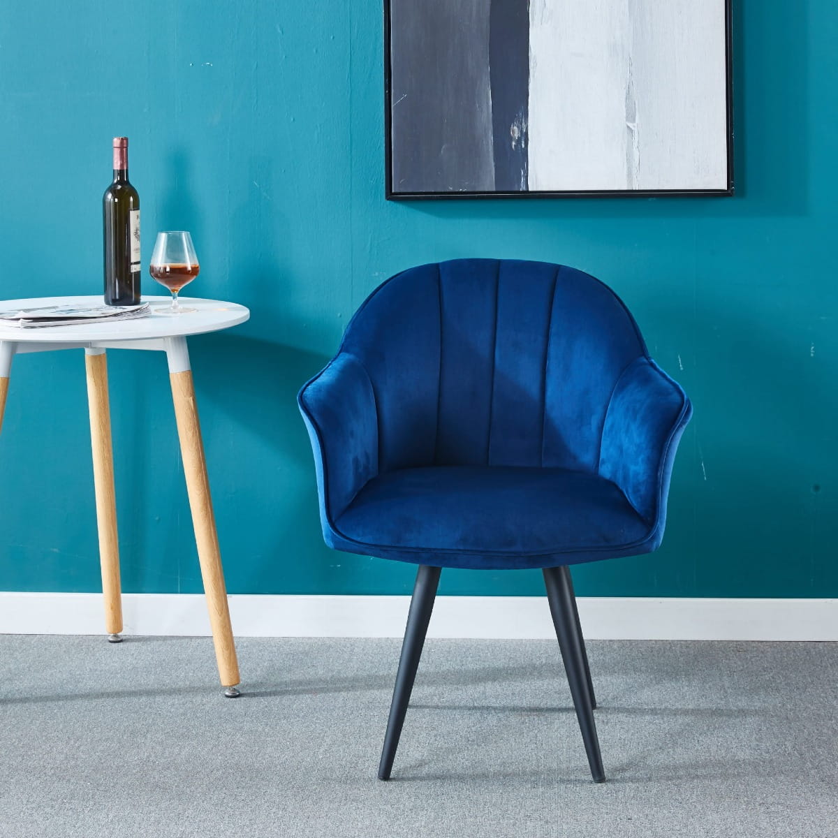 Fotel tapicerowany Alaska granatowy, nogi białe pikowany welur