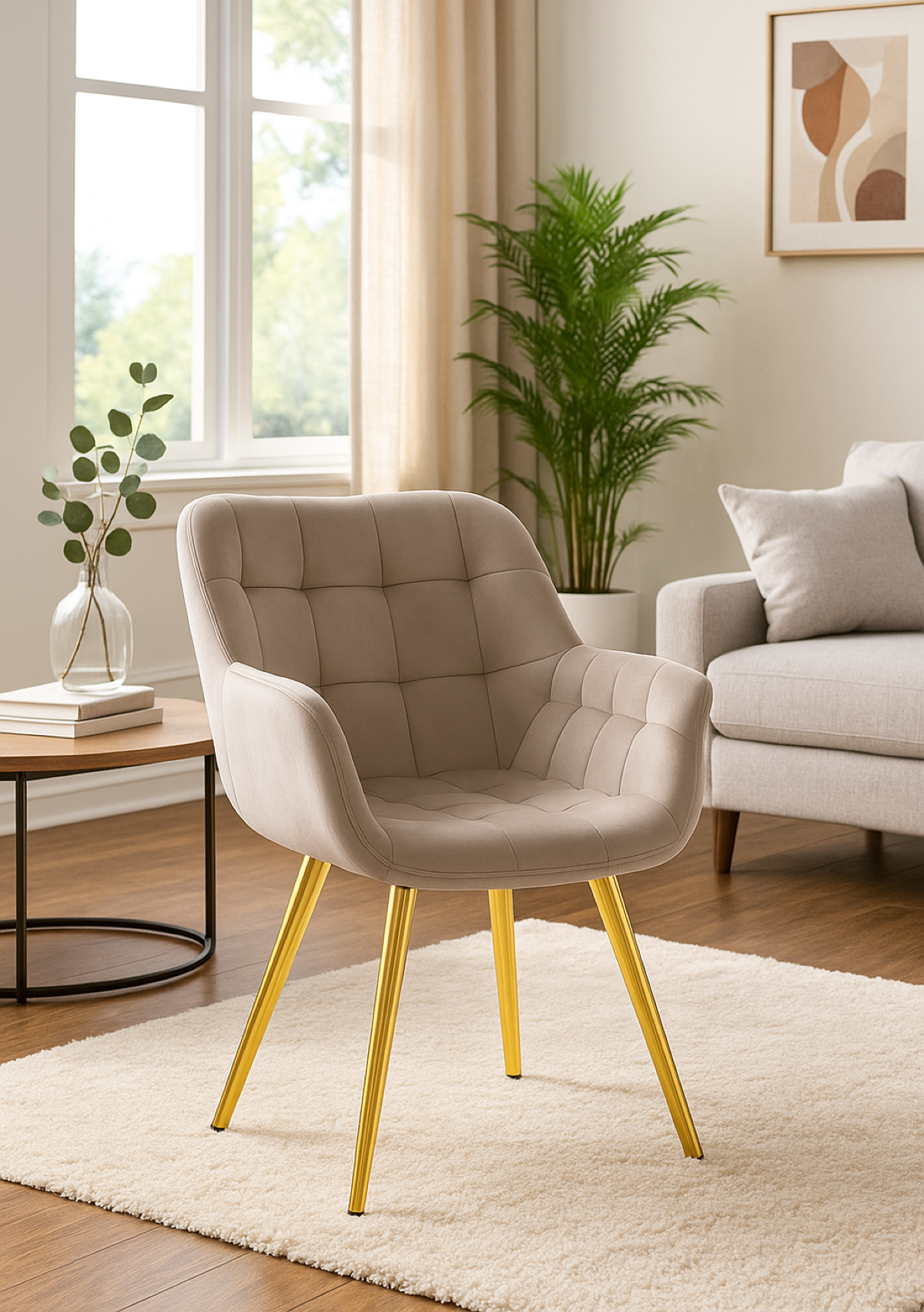 Fotel tapicerowany Alaska beżowy, nogi złote pikowany welur