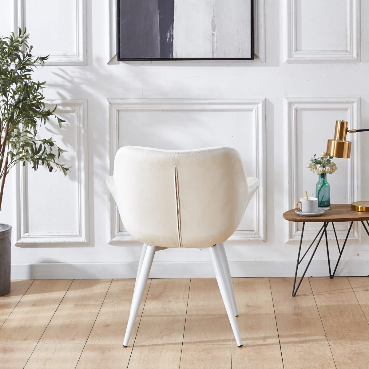 Design: Fotel Alaska to połączenie nowoczesnego designu z subtelną elegancją. Jego tapicerowane siedzisko i oparcie z miękkiego weluru nadają mu niepowtarzalny urok, podczas gdy białe metalowe nogi dodają lekkości i świeżości aranżacji wnętrza. Podłokietniki zapewniają dodatkowe wsparcie i wygodę, podkreślając jednocześnie luksusowy charakter krzesła.