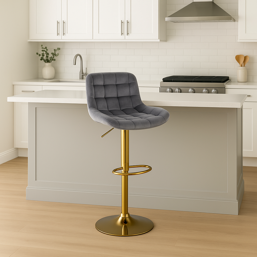 Krzesło barowe regulowane, obrotowe z siedziskiem welurowym i nogą złotą to ekskluzywny mebel, który wprowadzi do Twojego wnętrza atmosferę luksusu i elegancji. To wyjątkowe krzesło barowe nie tylko zapewni komfort użytkowania, ale także stanie się stylowym akcentem w każdej przestrzeni.