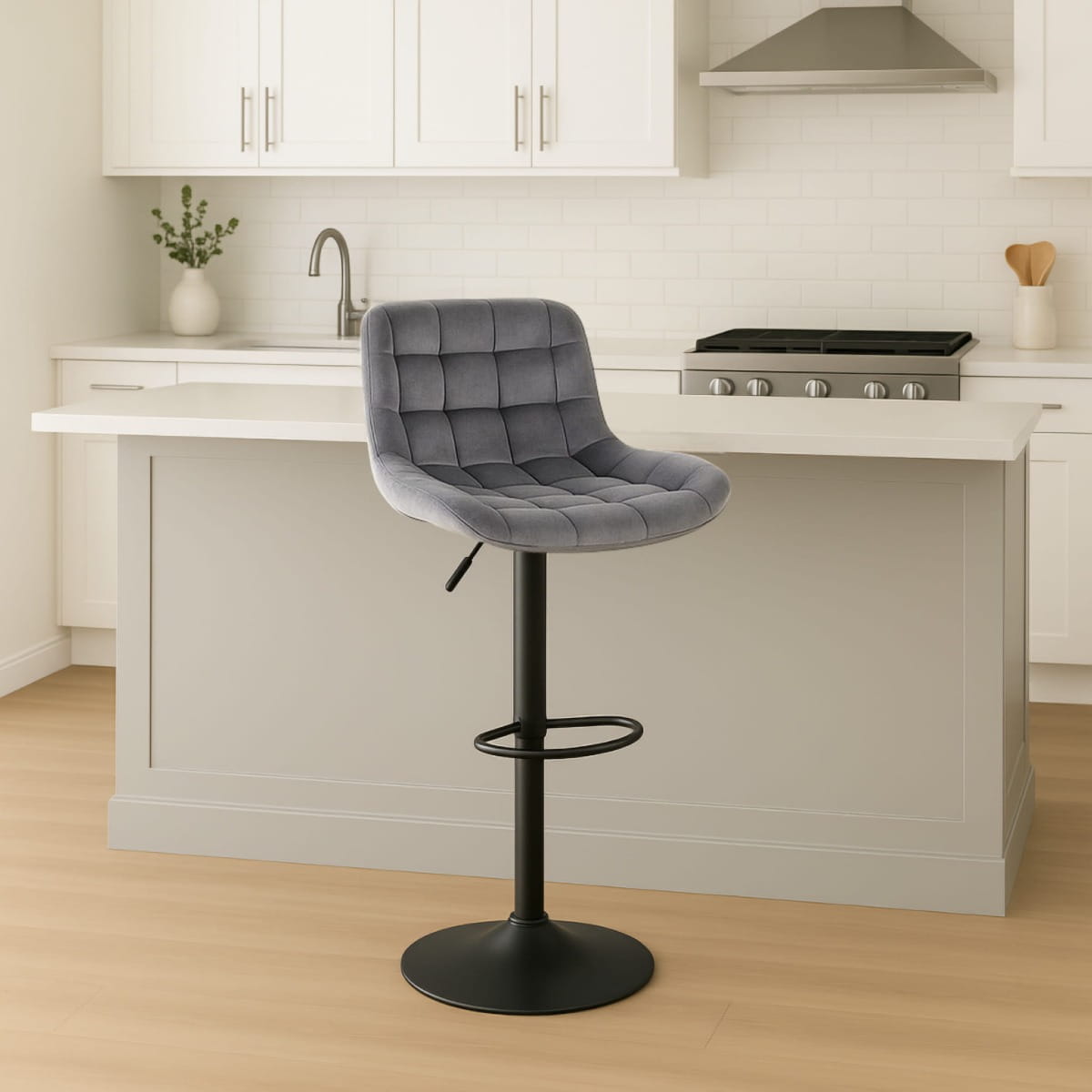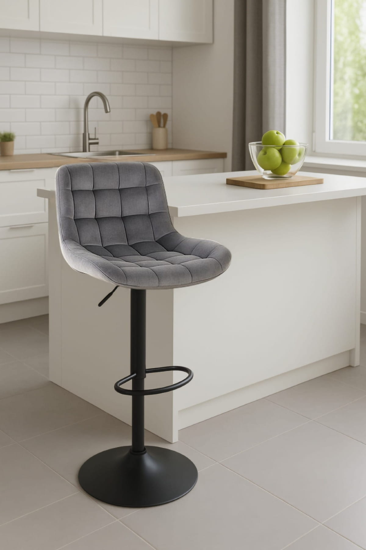 Krzesło barowe regulowane, obrotowe z siedziskiem welurowym i nogą czarną to elegancki i funkcjonalny mebel, który doskonale wprowadzi nowoczesny akcent do Twojej przestrzeni. To doskonały wybór do baru, kuchni wyspowej lub przestrzeni do relaksu.