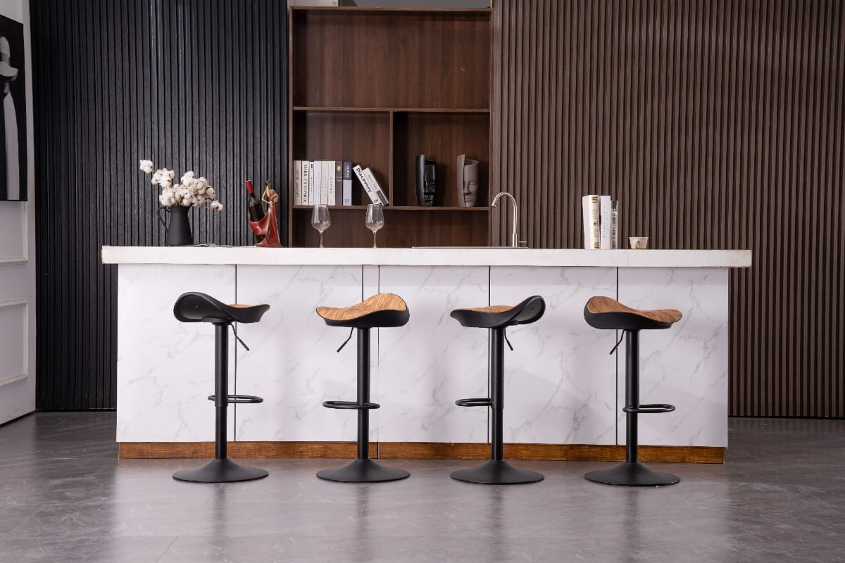Wytrzymałe Materiały: Solidna metalowa noga gwarantuje stabilność i trwałość, zapewniając spokój i pewność użytkowania. Okleina drewnopodobna siedziska nie tylko dodaje elegancji, ale także ułatwia utrzymanie hokera w doskonałym stanie przez wiele lat.