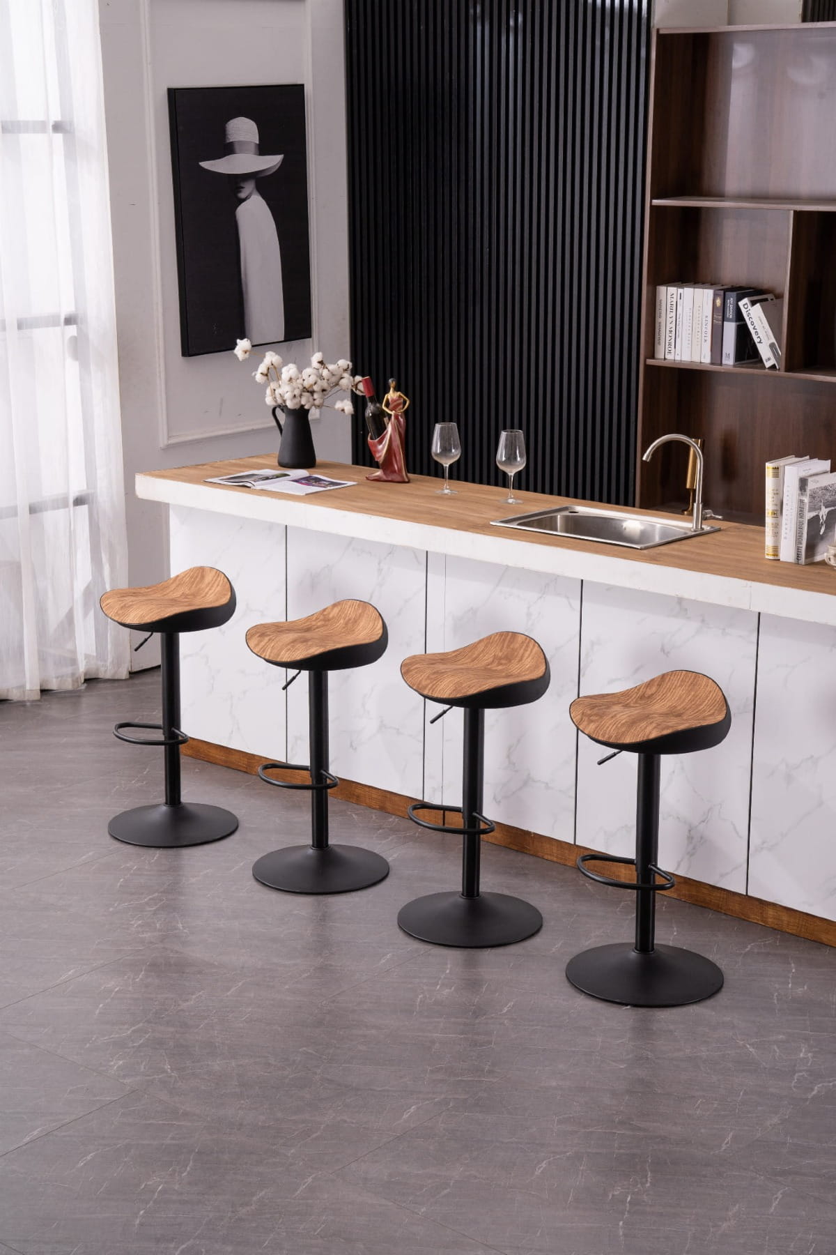 Elegancja z Naturalnym Akcentem: Hoker Mubi zachwyca swoją elegancją oraz naturalnym urokiem. Siedzisko obrotowe pokryte okleiną drewnopodobną nadaje mu przytulnego i ciepłego wyglądu, jednocześnie harmonijnie współgrając z nowoczesnymi wnętrzami.