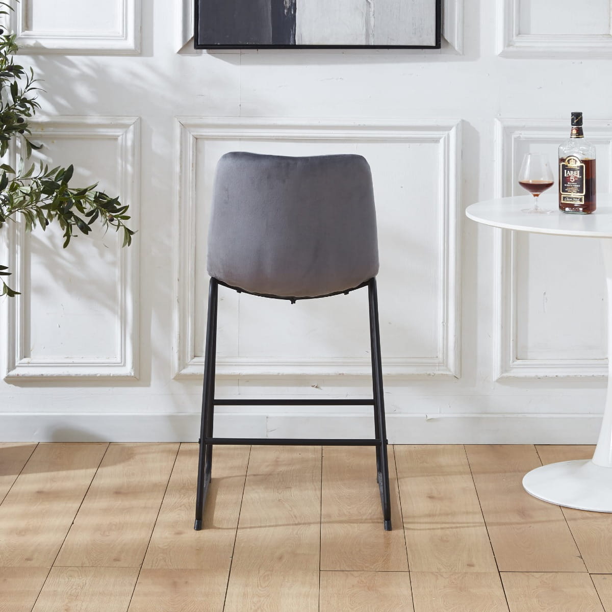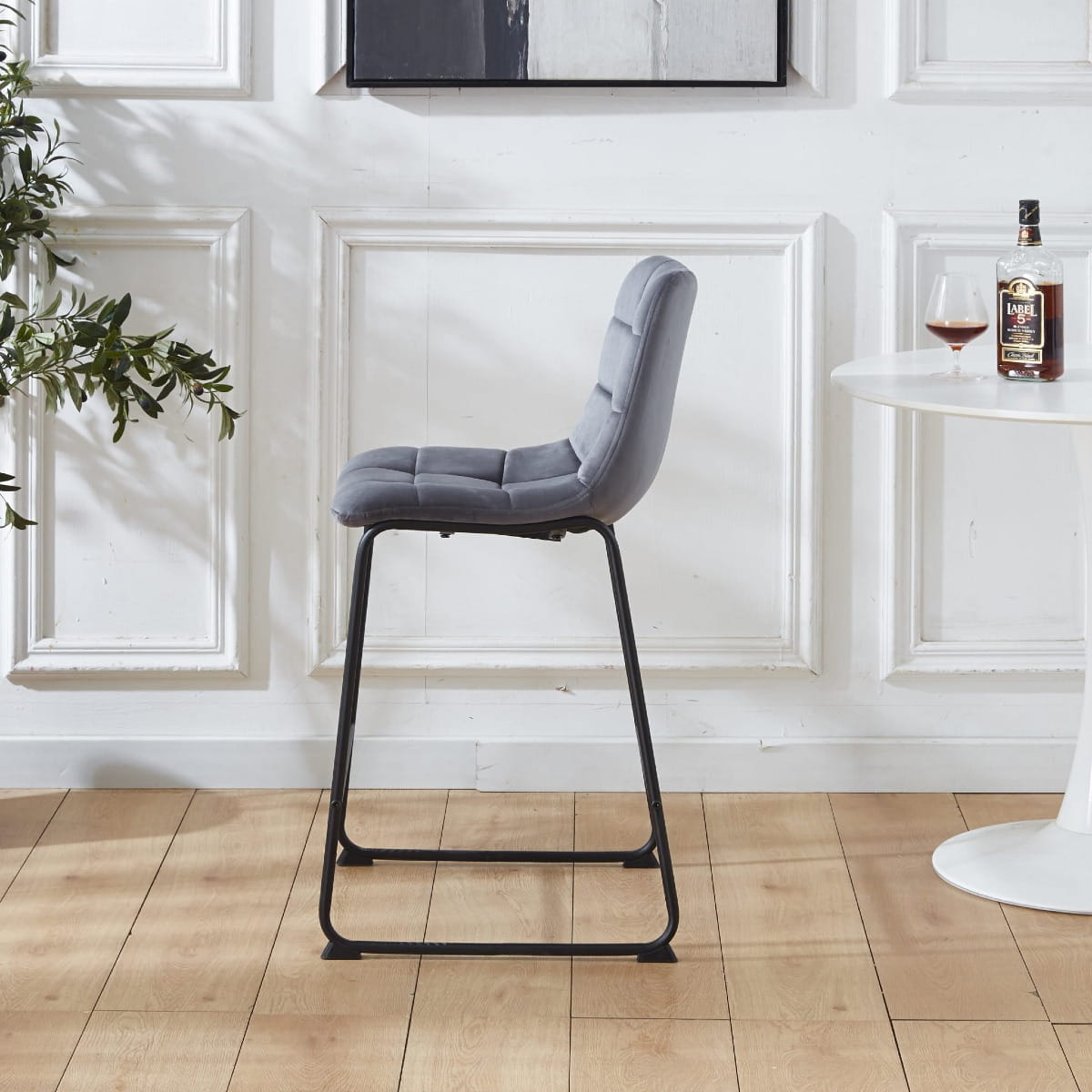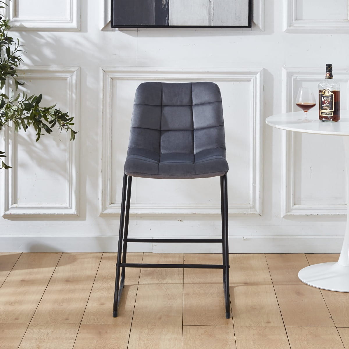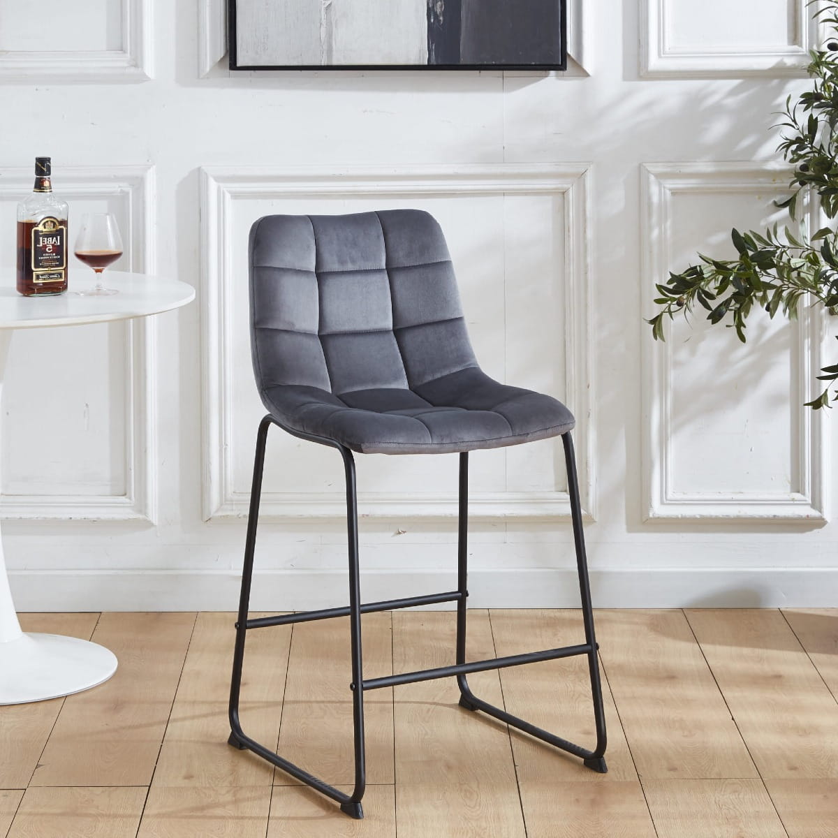 Podstawę hokera stanowią solidne, czarne metalowe nogi, które zapewniają stabilność i trwałość. Ich nowoczesny, minimalistyczny design idealnie kontrastuje z miękkim welurem, tworząc harmonijną całość. Dodatkowym atutem jest poprzeczka pełniąca funkcję podnóżka, co zwiększa komfort użytkowania.