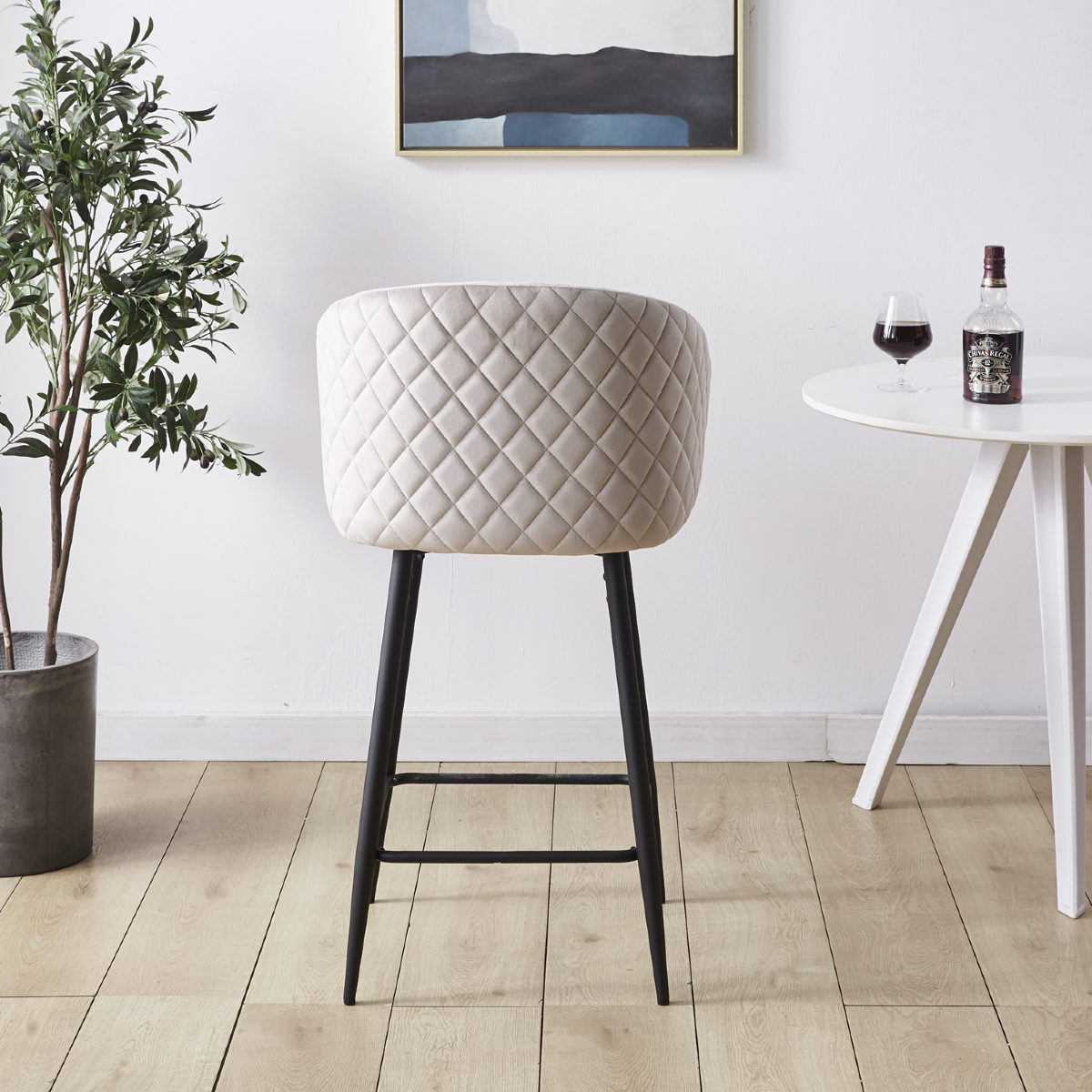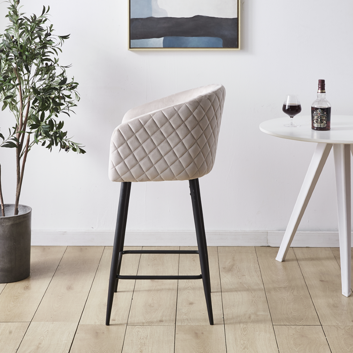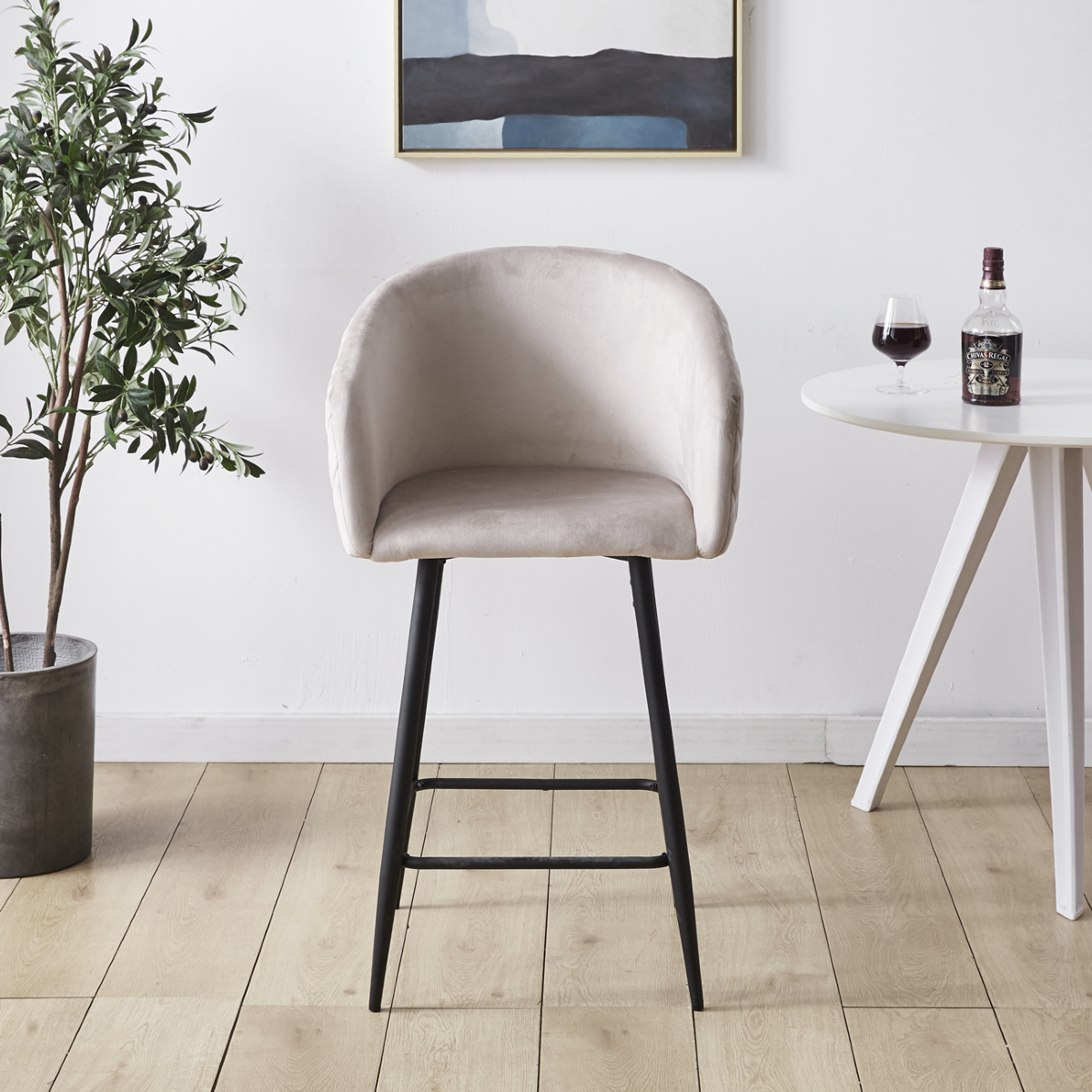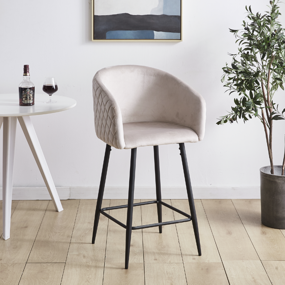 Hoker nasz doskonale nadaje się do wnętrz w stylu skandynawskim, i nowoczesnym. Wykonane z wytrzymałej tkaniny welurowej typu velvet w kolorze beżowym, krzesło będzie się pięknie wyróżniało na tle każdego pokoju a jednocześnie nie będzie przytłaczało wystroju dzięki swojej lekkiej formie. Stabilna metalowa podstawa malowana proszkowo na kolor czarny, cechuje się wysoką odpornością na uszkodzenia i trwałością na długie lata.