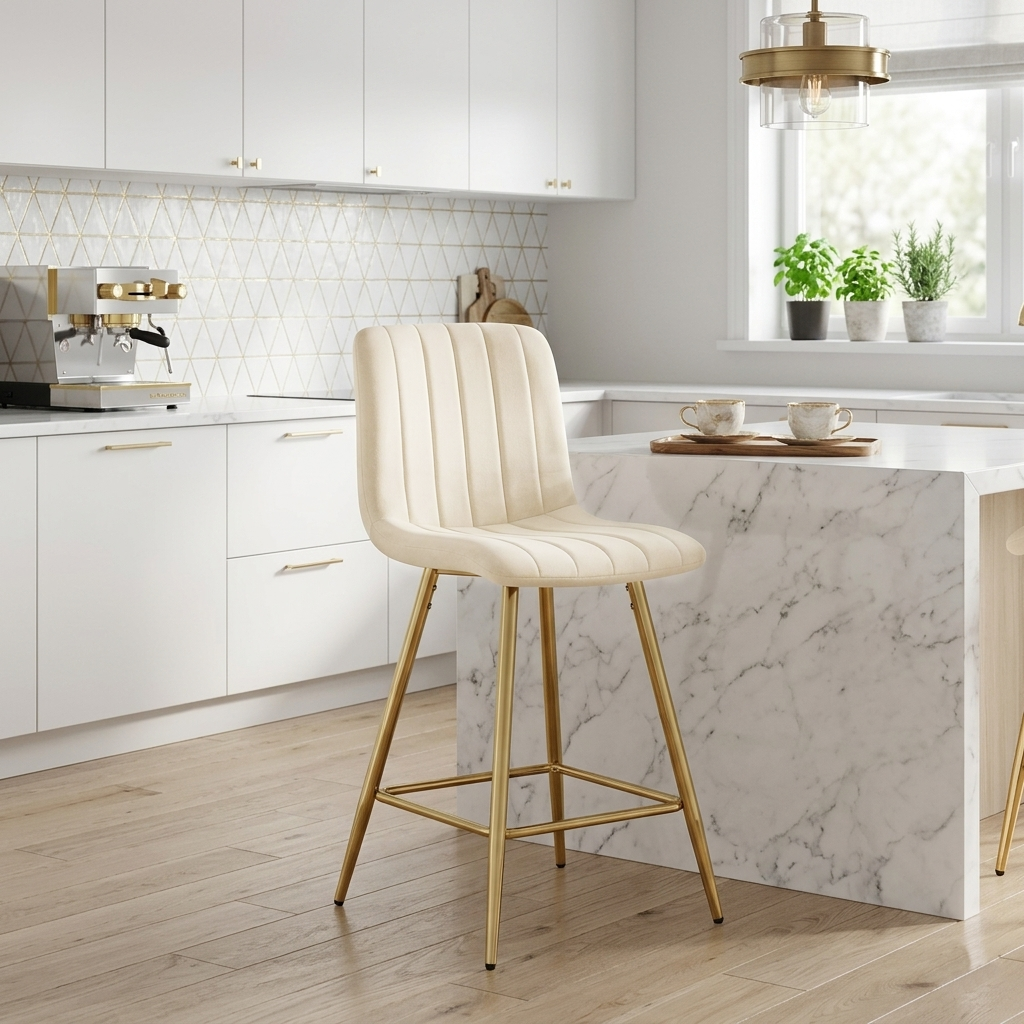 Dodaj swojej kuchni lub jadalni luksusowego charakteru z hokerem Alan tapicerowanym welurem na eleganckich złotych nogach. Ten stylowy mebel to idealne połączenie komfortu i nowoczesnej estetyki z nutą glamour. Wysokość siedziska 62 cm sprawia, że świetnie sprawdzi się przy wyspach i półwyspach kuchennych.
