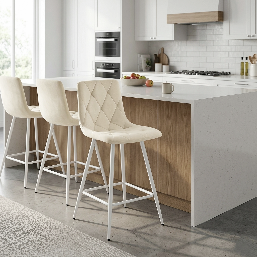 Postaw na subtelność i świeżość w aranżacji wnętrza dzięki hokerowi Tom tapicerowanemu welurem na stylowych białych nogach. To idealne rozwiązanie do nowoczesnych kuchni, jadalni czy wysp kuchennych, gdzie liczy się zarówno wygoda, jak i design. Wysokość siedziska 62 cm sprawia, że model Alan świetnie pasuje do blatów o standardowej wysokości.