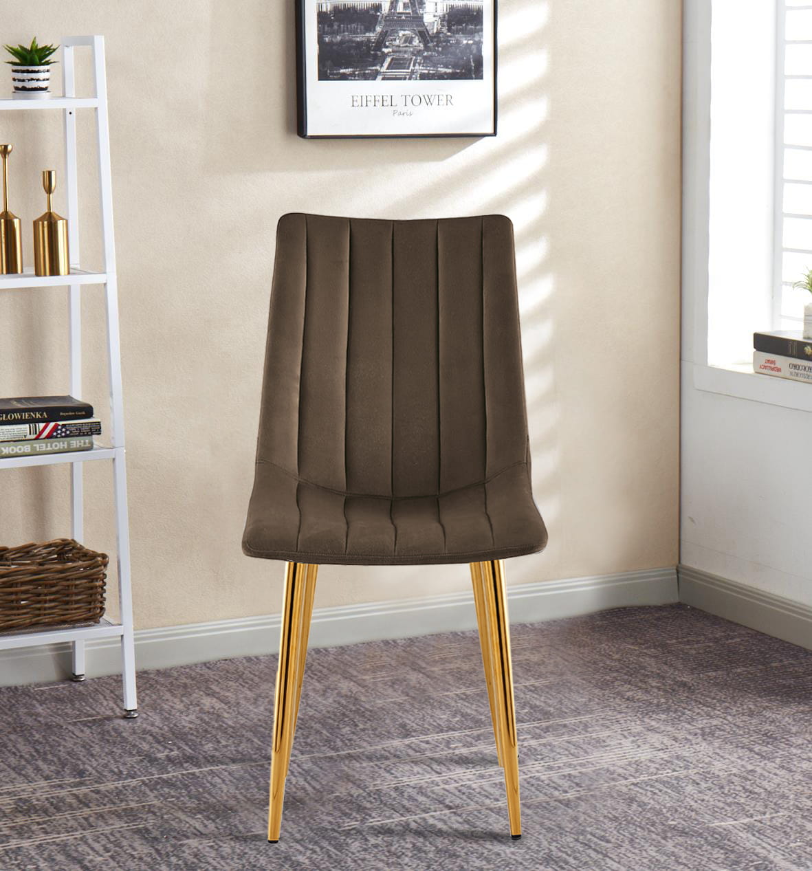 Krzesło tapicerowane Tom jasno brązowe welur, nogi złote