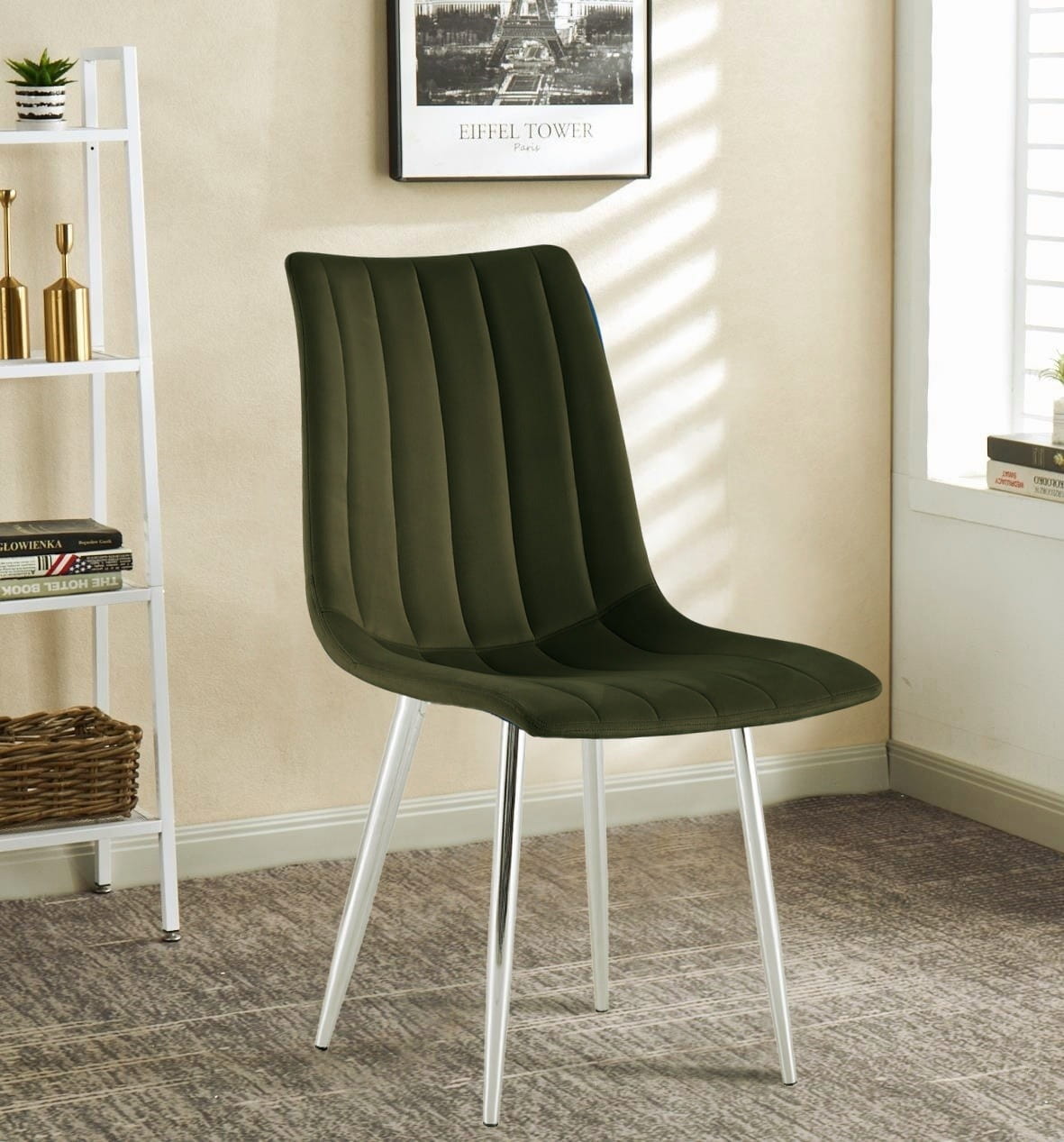 Krzesło tapicerowane Alan zielone, nogi chrom welur