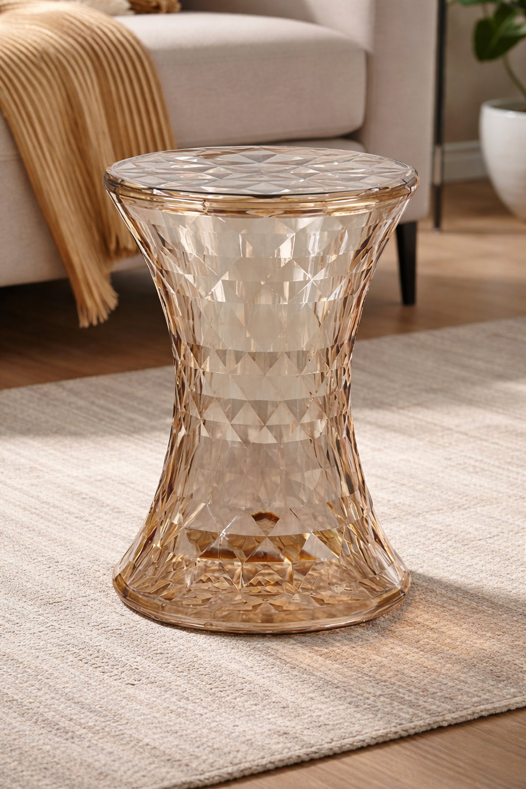 Dodaj elegancji i nowoczesności do swojego wnętrza dzięki naszemu stołkowi w kształcie klepsydry z fakturą diamentu.