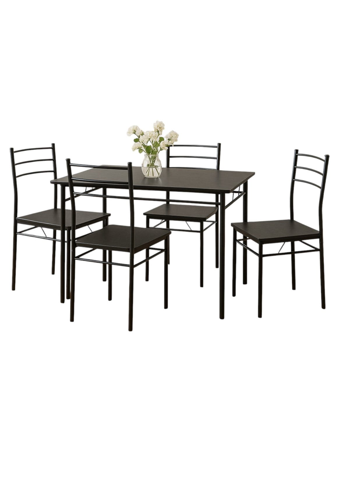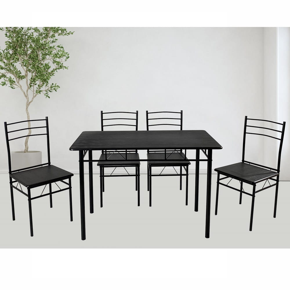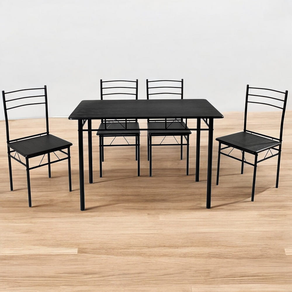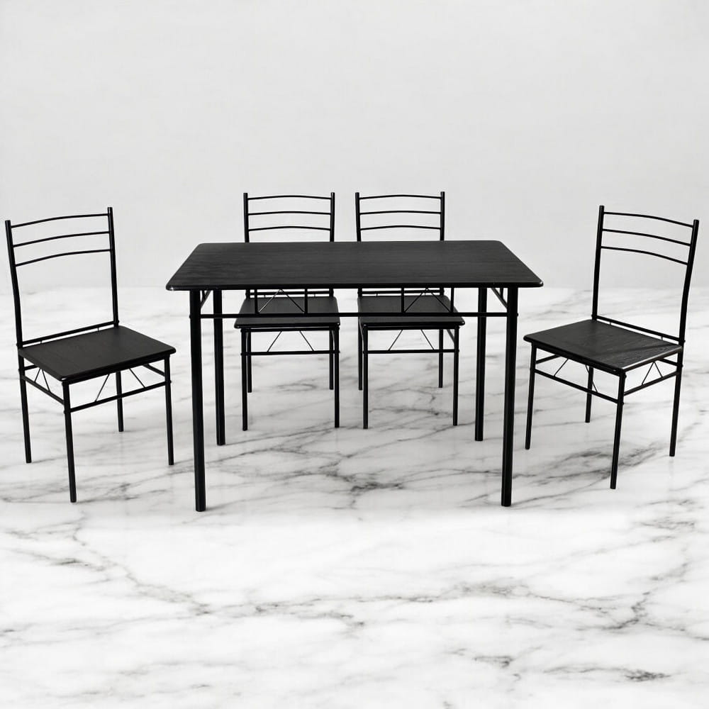Zaprezentuj swoją jadalnię w nowym świetle dzięki naszemu kompletnemu zestawowi, który łączy w sobie elegancję, funkcjonalność i solidność wykonania. Nasz prostokątny stół z blatem z płyty w okleinie w kolorze czarnym na solidnych metalowych nogach to idealne miejsce na spotkania rodzinne i przyjęcia ze znajomymi. Dodatkowo, zestaw zawiera 4 krzesła z siedziskiem również wykonanym z płyty w okleinie w kolorze czarnym, które harmonijnie komponują się z stylem stołu.