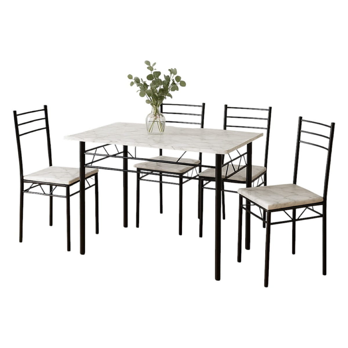 Wygodne Krzesła: Krzesła w zestawie również posiadają siedziska z płyty w okleinie w kolorze białym, marmurkowym, które gwarantują wygodę podczas długotrwałego siedzenia. Metalowe nogi zabezpieczone są przed korozją, co zapewnia trwałość i stabilność krzeseł.