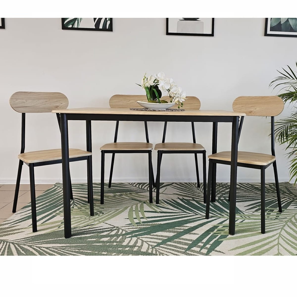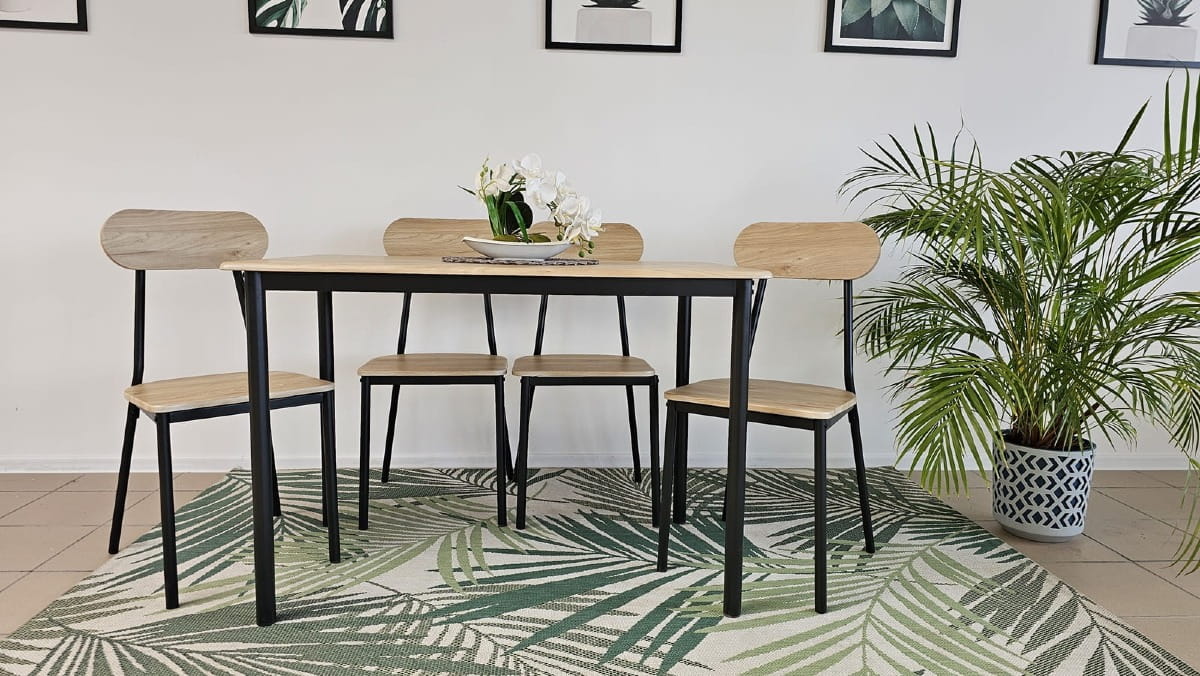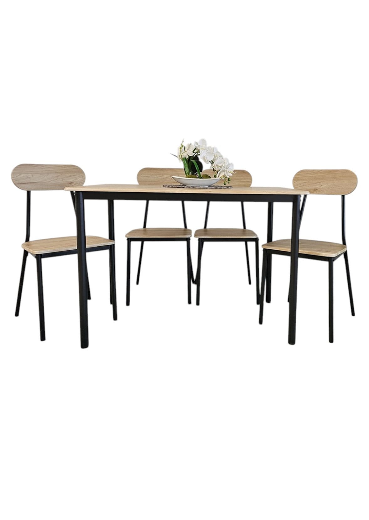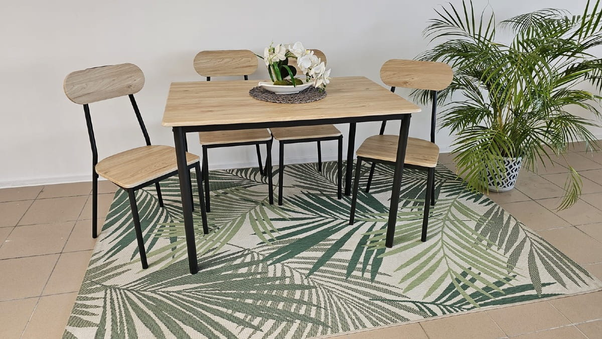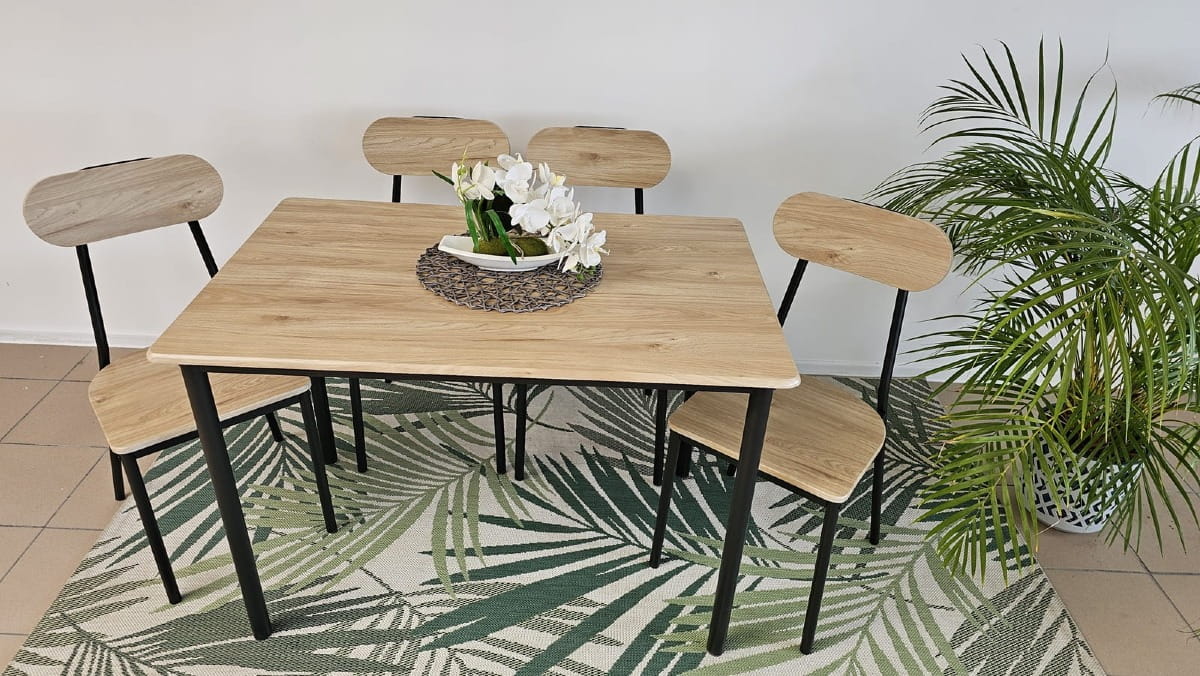 Krzesła: Krzesła w tym zestawie zachwycają prostotą i wygodą. Ich siedziska i oparcia wykonane są z tej samej okleiny drewnopodobnej co blat stołu, co sprawia, że cały zestaw prezentuje się spójnie i elegancko. Czarne metalowe nogi krzesła dodają nowoczesności i lekkości, tworząc harmonijne połączenie z resztą mebli.
