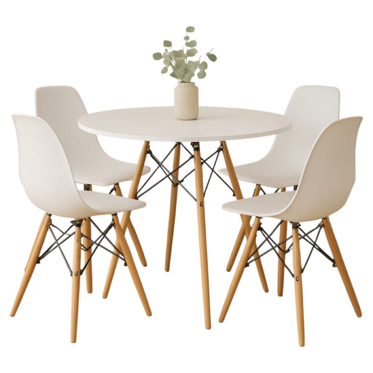 Zestaw stół okrągły Paris 90 cm + 4 krzesła Milano białe nogi bukowe